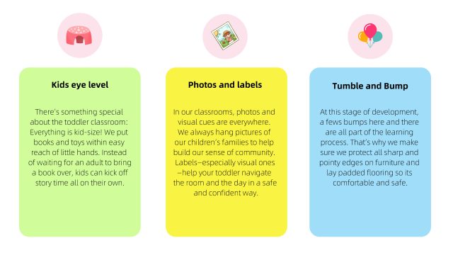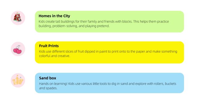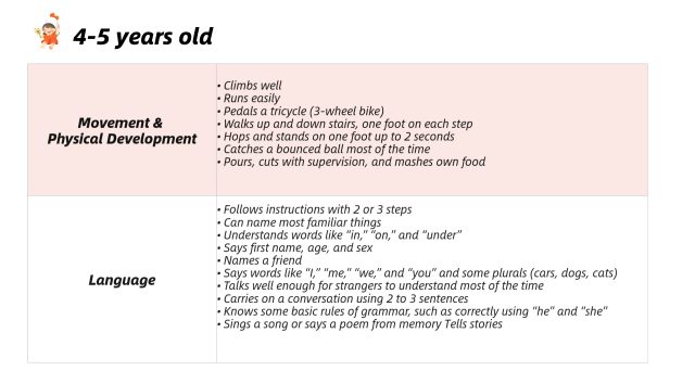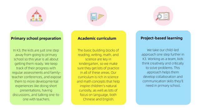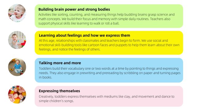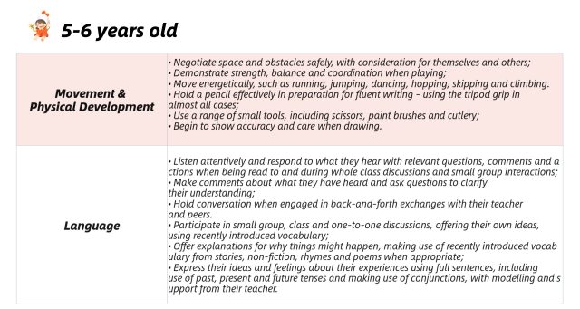 Our teachers are constantly monitoring the development of our children, which we will compare to a set of standard development milestones for each age range. We design activities based on these milestones and we want our activities to be ideal for the age group, that’s why we set such specific learning milestones.