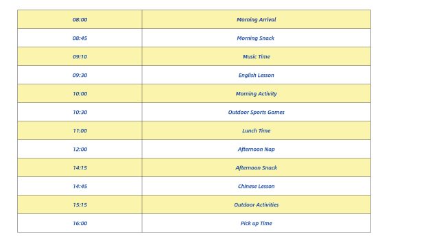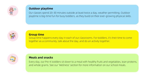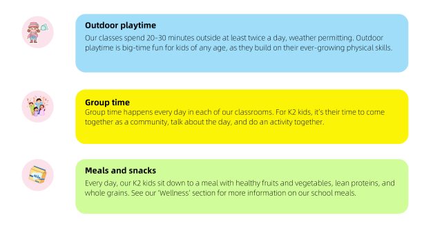 Our K2 classroom will follow a daily schedule. No matter what play and learning activities they’re engaged in, preschoolers always come together for group time, to play outside, and to enjoy healthy meals with one another.